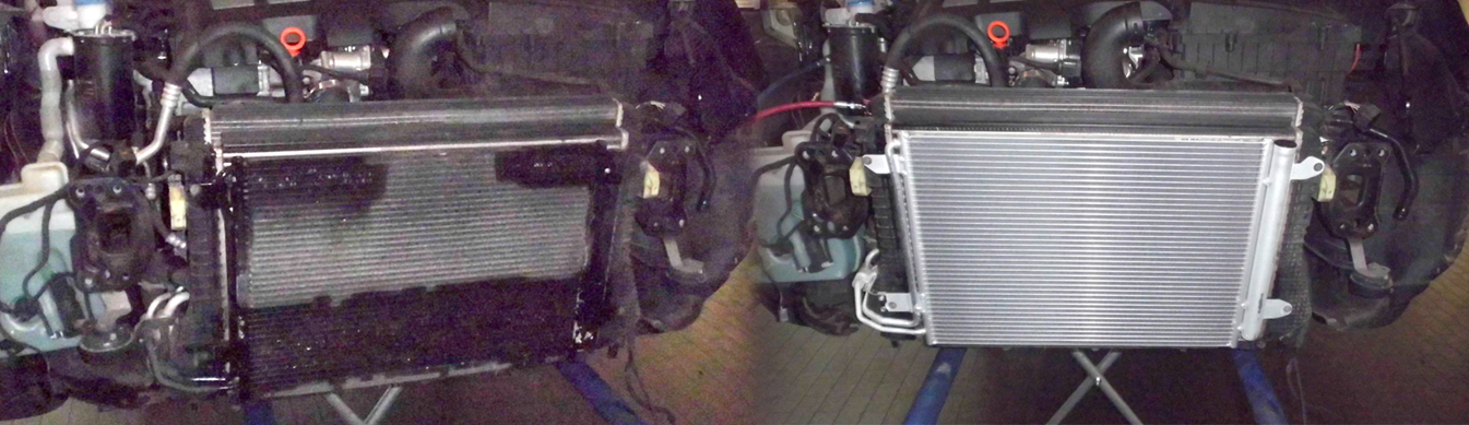Doch je weniger Kältemittel für den Wärmetransport in der Anlage vorhanden ist, desto höher wird der Kraftaufwand vom Gasverdichter (Kompressor). Zusätzlich kann im Laufe der Zeit der Klimakondensator verschmutzen oder Kühlrippen sind herausgebrochen. Dadurch verschlechtert sich die Wärmeabgabe während des Betriebes, worauf der Druck im System ansteigt. D.h. der Gasverdichter kämpft und kämpft gegen Druck und Temperatur auf verlorenem Posten, bis er frühzeitig stirbt. Und dann wird es für den Kunden teuer. Daher ist es ratsam, die Klimaanlage jährlich überprüfen zu lassen. Dieses kann meistens im Rahmen der Fahrzeuginspektion durchgeführt werden.